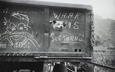 Peristiwa: Seekor anjing memandang dari lubang sebuah truk militer Belanda milik Tijger Brigade yang dicoreti dengan tulisan Waar is Soekarno? (Mana Soekarno?) semasa Aksi Polisionil 1.