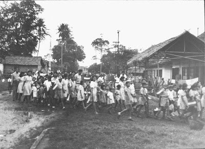 Peristiwa: Di masa pendudukan Jepang, militer Jepang mengasingkan para lelaki Belanda ke Manchuria, atau menahannya misalnya di penjara militer Glodok. Kaum wanita dan anak-anak diinternir di beberapa kamp tawanan; salah satu yang terkenaladalah kamp Cideng. Foto di atas memperlihatkan kamp Cideng, sekitar 7 bulan setelah dibebaskan oleh pasukan Inggris. Anak-anak penghuni kamp tampak berbaris untuk merayakan hari ulang tahun Ratu Juliana.