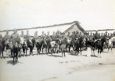 | Pasukan kavaleri Belanda di Cot Mancang. Perwira yang mengangkat telunjuk di samping kuda adalah Mayor Wichers. (klik untuk memperbesar | © Universiteit Leiden) |