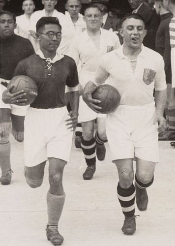 Peristiwa: Kesebelasan Hindia-Belanda dalam pertandingan persahabatan melawan Belanda (atas); dua pemain Hindia-Belanda di Piala Dunia sepakbola 1938