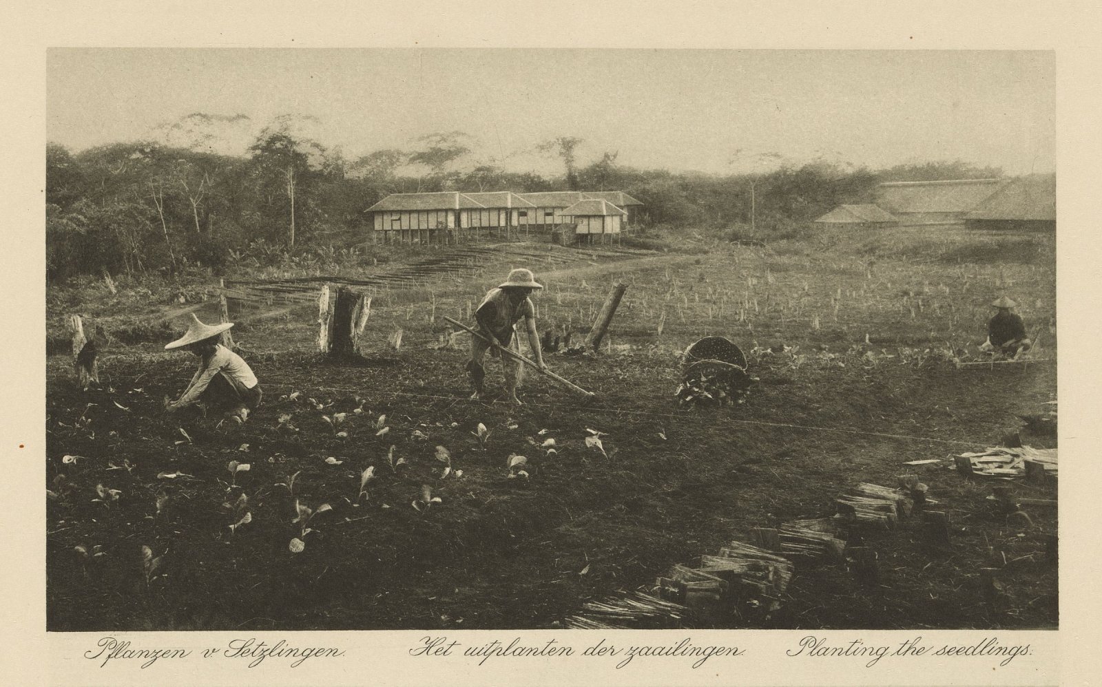 | Pekerja Keling dan Tionghoa serta mandor Belanda di area ladang tembakau (klik untuk memperbesar | © NGA) |