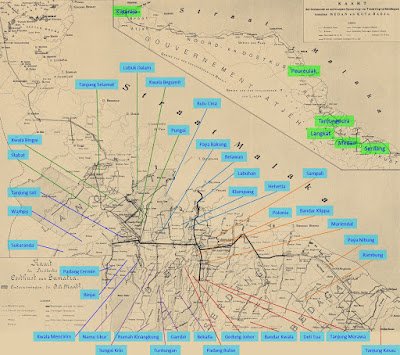 | Peta perkebunan tembakau di wilayah Deli, Langkat, dan Serdang (klik untuk memperbesar) |