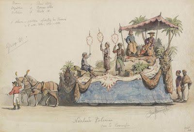 Di posting 2 hari lalu kita melihat pemuda-pemudi Belanda di tahun 1938 berpawai mengenakan kostum tradisional Nusantara untuk merayakan 40 tahun bertahtanya Ratu Wilhelmina. Berikut konsep kereta pawai untuk berparade di Belanda pada bulan Mei 1874, dalam rangka menyambut 25 tahun bertahtanya Raja Willem III van Oranje-Nassau.