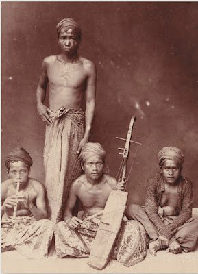 | ~1870-1880: Empat pria Jawa, dua di antaranya berpose dengan seruling dan rebab (klik untuk memperbesar | @ Indies Gallery) |