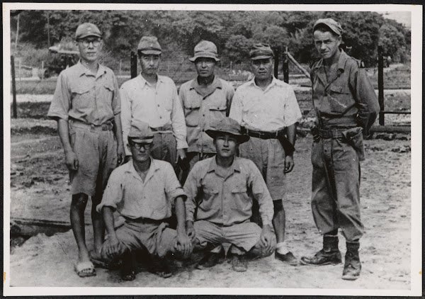 | Enam tentara Jepang, kemungkinan perwira, dalam penjagaan seorang sersan KNIL, di sebuah kamp yang dikelilingi dinding kawat berduri (klik untuk memperbesar | © Beeldbank WO2 / NIOD) |