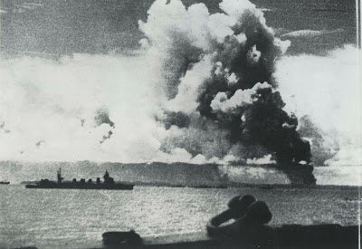 | Kapal perang Jepang “Naka” dalam usaha menduduki Tarakan dengan latar belekang kepulan asap peperangan (klik untuk memperbesar | © Beeldbank WO2 / NIOD) |