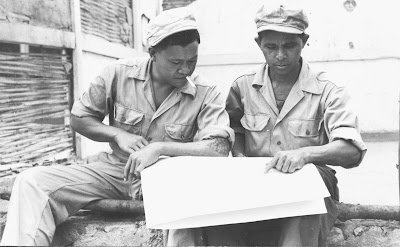 | Dua warga Minahasa yang menjadi bagian dari kesatuan Belanda, Mandagi (kiri) dan Montalalu (kanan) mempelajari peta (klik untuk memperbesar | © Beeldbank WO2 / NIOD) |