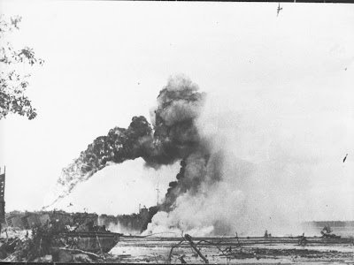 | Foto ini memperlihatkan kepulan api dan asap dari pesawat-pesawat Jepang yang dijatuhkan Sekutu (klik untuk memperbesar | © Beeldbank WO2 / NIOD) |