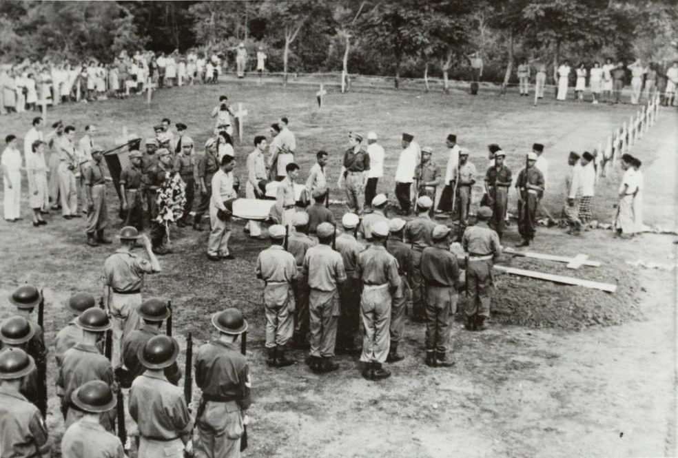Peristiwa: Pasukan Belanda, tentara Inggris, dan beberapa warga lokal (terlihat bersarung dan berpeci) mengadakan pemakaman atas sisa jasad dari M. Schilling dan Haji Mochtar bin Haji Mutalib yang dieksekusi tentara Jepang di tahun 1942.