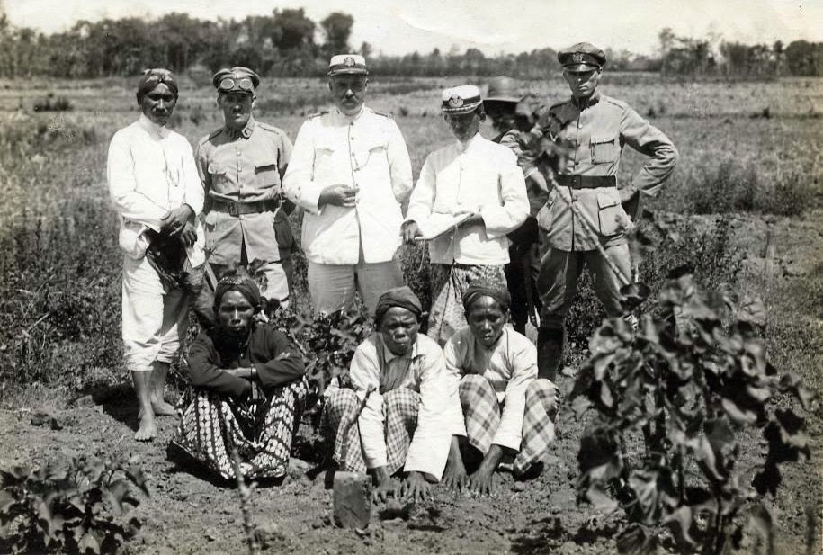 Peristiwa: Kepolisian Hindia-Belanda berpose di belakang tersangka (jongkok, kiri) di kasus pembunuhan terhadap Bronto Tissot, dan dua kaki tangannya (jongkok, kanan).
