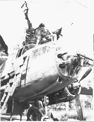 | Canberra: Seorang kopral KNIL Udara bernama Rumuat Cumentas (?) mengoperasikan sebuah gasoline spray gun ke sebuah pesawat pembom (klik untuk memperbesar | © Beeldbank WO2 / NIOD) |