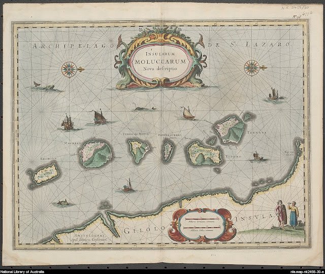Catatan: Peta ini dibuat di Belanda oleh Jan Jansson di tahun 1636 dan memperlihatkan pulau-pulau Halmahera (Gilolo/Jailolo), Hiri (Harrij), Ternate, Maitara (Miterra), Tidore, Mare (Pottebackers Eylandt), Moti (Timor/Motir), Makian (Machian), dan Bacan (Bachian).