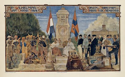 Poster di atas menyambut 25 tahun bertahtanya Wilhelmina sebagai Ratu Belanda, dan memuat banyak perlambang. Nona Belanda kali ini ditampilkan ada dua. Yang di sebelah kanan menyambut masyarakat Belanda yang a.l diwakili oleh kalangan bangsawan, militer, cendekiawan, masyarakat pedesaan, pekerja, pelaut, dll. dengan persembahan karya kebanggaan Belanda a.l. kapal laut dan lukisan. Yang di sebelah kanan, dengan latar belakang pepohonan, menyambut warga Nusantara seperti orang Jawa, Aceh, Minang, Bali, dan Dayak dengan didampingi (atau dijaga?) tentara KNIL dan pejabat kolonial Belanda. Persembahan dari arah kanan bentuknya adalah gamelan, kerajinan tangan, tenunan, dan buah-buahan.