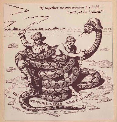 | ~1943: Poster ini menyerukan kerjasama antara Belanda, dengan klewang, dan pribumi, dengan keris, untuk membebaskan diri dari lilitan ular militer Jepang (klik untuk memperbesar | © Harry Waters Armstrong / Beeldbank WO2 / NIOD) |