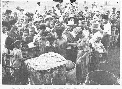 • Teks asli penyerta foto:Zodra het volk bevrijd was verdrong het zich om de keuken van onze troepen om, als het mogelijk was, een restantje te krijgen. Uitgehongerd en arm – zo vonden we de bevolking in de rijkste streken van Java.