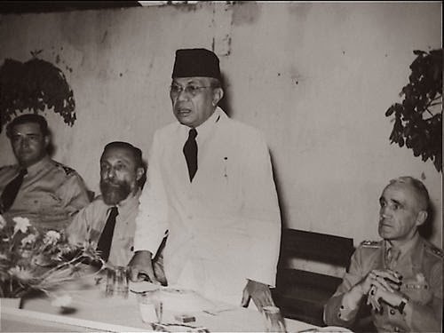| Wali Negara Madura, R.A.A. Cakraningrat, berbicara di acara pembentukan tentara Madura di Bangkalan; di sebelah kanannya duduk Panglima Tentara Belanda di Jawa Timur Mayjen W.J.K. Baay. (© gahetna) |