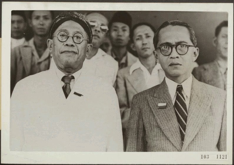 | Presiden Negara Pasundan, R.A.A. M.M. Suria Kartalegawa (kiri) beserta “Menteri Penerangan” Kustomo, dalam proklamasi pendirian Negara Pasundan di Bandung, 4 Mei 1947, yang dimotori Partai Rakyat Pasundan. [klik untuk memperbesar (c) gahetna] |