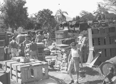Sebuah kesatuan militer Belanda membongkar pasokan logistik yang tampaknya amunisi dan persenjataan. Di latar belakang tampak beberapa truk tentara di dekat sebuah bangunan bertingkat. Di pojok kanan bawah tampak dua bocah menatap ke kamera.