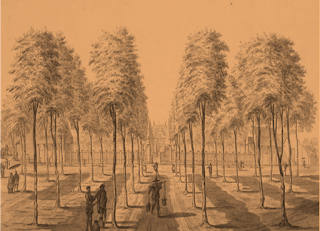 Dalam lukisan terlihat lurus ke selatan adalah jalan Kramat menuju Buitenzorg.