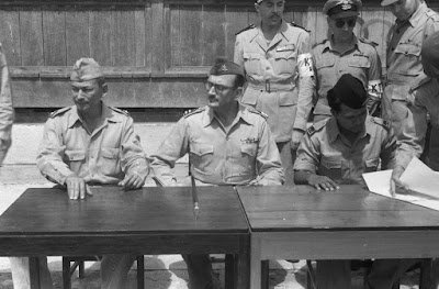 | Kolonel Ohl, Mayor Jenderal F. Mollinger, dan Slamet Riyadi, dengan tiga pengamat internasional di latar belakang (klik untuk memperbesar | © gahetna) |