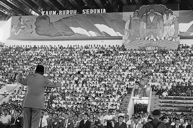 Peristiwa: Soekarno memberikan pidato di dalam peringatan Hari Buruh 1965.