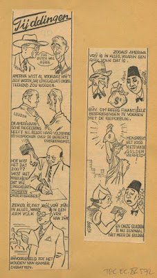 Peristiwa: Karikatur ini memperlihatkan pandangan si karikaturis bahwa Amerika menekan Belanda untuk menandatangani Perjanjian Linggarjati, dan di lain pihak menjanjikan Indonesia bantuan Dolar yang membuat Indonesia tidak mengacuhkan (Gulden-nya) Belanda.