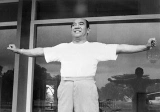 Catatan: Pantulan helikopter kepresidenan tampak terlihat di kaca di belakang Soekarno.