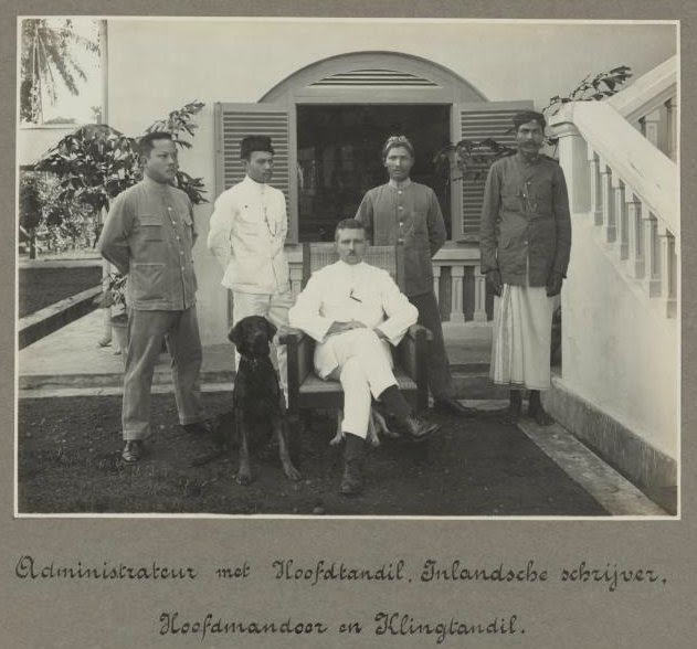 Peristiwa: Tuan Belanda sebagai administrator perkebunan di Binjai duduk bersama anjingnya, dikelilingi para mandor dan juru tulis dari Tiongkok, Jawa, dan Tamil.