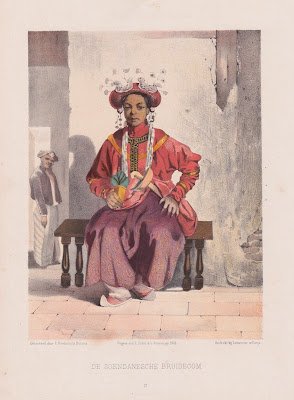 | Kali ini Hardouin menampilkan pengantin Sunda, yang mengenakan pakaian dasar mirip pengantin Betawi sebelumnya, yaitu baju kurung merah dengan kain panjang berwarna ungu. Perbedaan terletak di hiasan kepala yang didominasi warna perak dengan motif seperti kuda. Kemudian tampaknya zaman dulu, pengantin perempuan Sunda mengenakan juga keris, serta membawa semacam pot bunga kecil dengan sebuah pohon di dalamnya. Sang pengantin juga tidak nyeker, tetapi memakain semacam terompah, yang juga memperlihatkan bahwa dia mengenakan celana panjang putih di balik kain ungunya. (klik untuk memperbesar | @ Indies Gallery) |