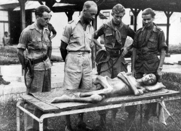 Tentara Belanda mengamati seorang Indonesia yang kurang gizi semasa perang kemerdekaan