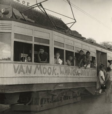 Peristiwa: Masyarakat di sebuah trem yang ditulisi slogan meledek Van Mook.