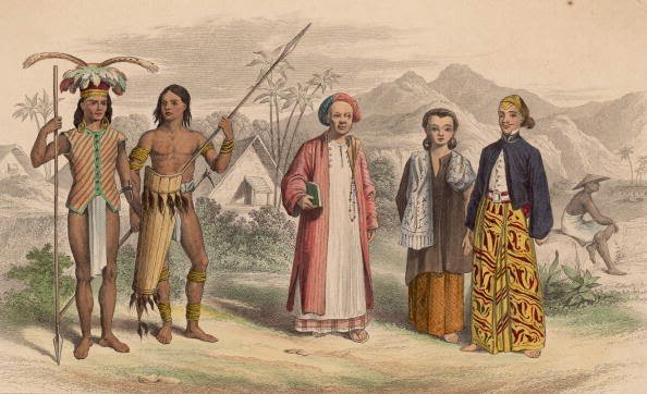 Catatan: Lukisan di atas adalah karya A. Huttula, yang kemudian diolah oleh R. Anderson, menampilkan dua lelaki Dayak (dari “Saghai” dan “Loondoo”), seorang ulama Jawa, dan satu pasangan Jawa.